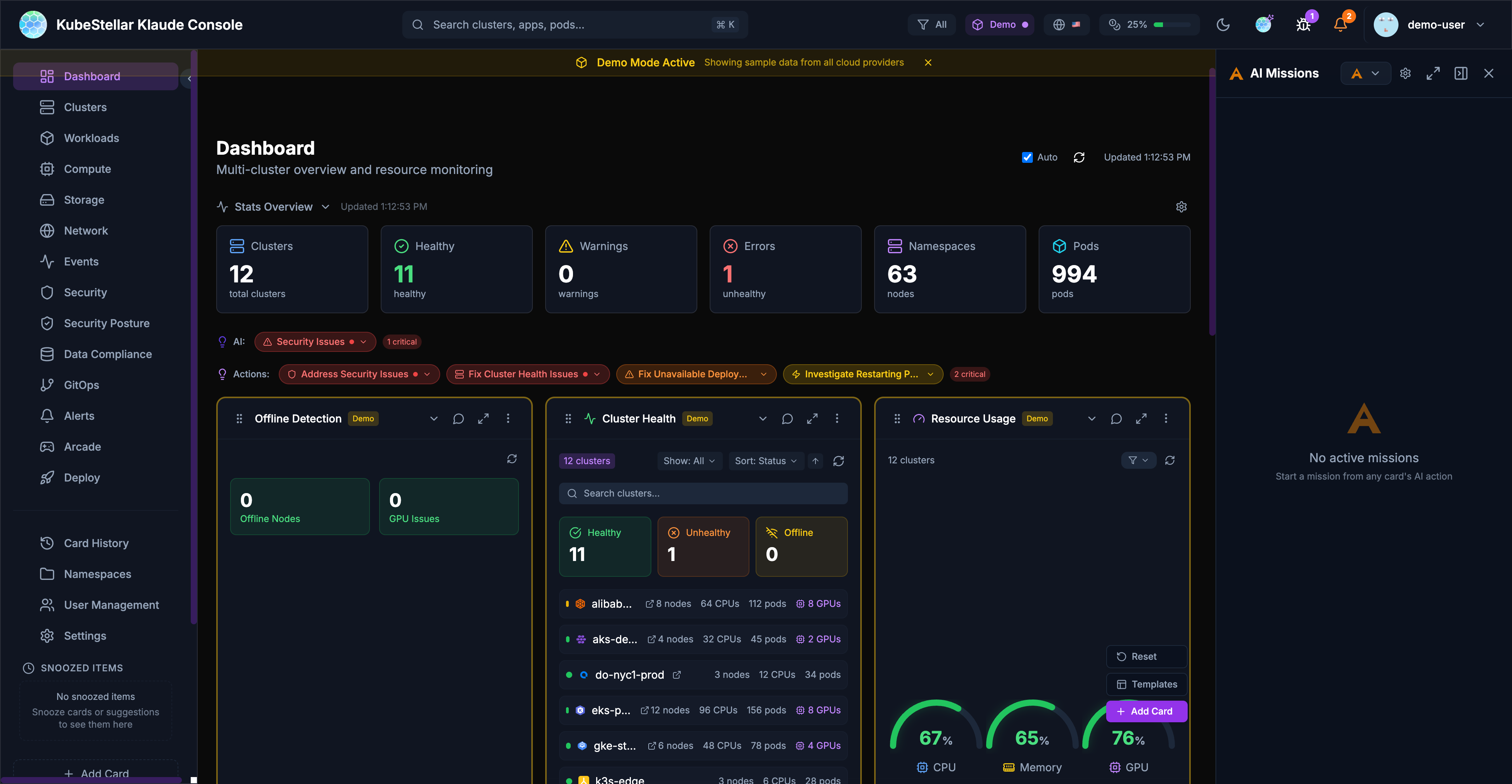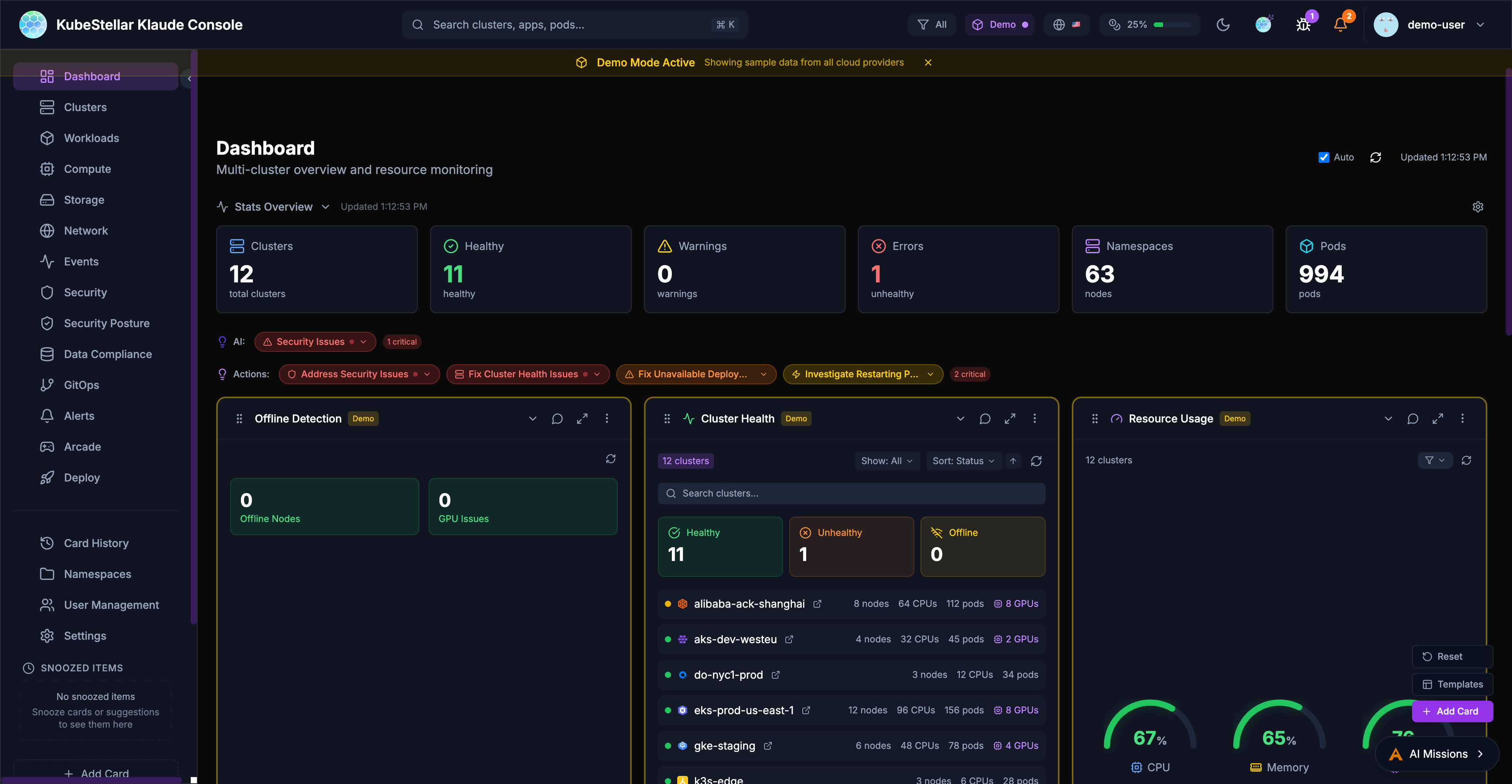 The KubeStellar Klaude Console is a modern, AI-powered multi-cluster management interface that provides real-time monitoring, intelligent insights, and a customizable dashboard experience for managing Kubernetes clusters at scale.